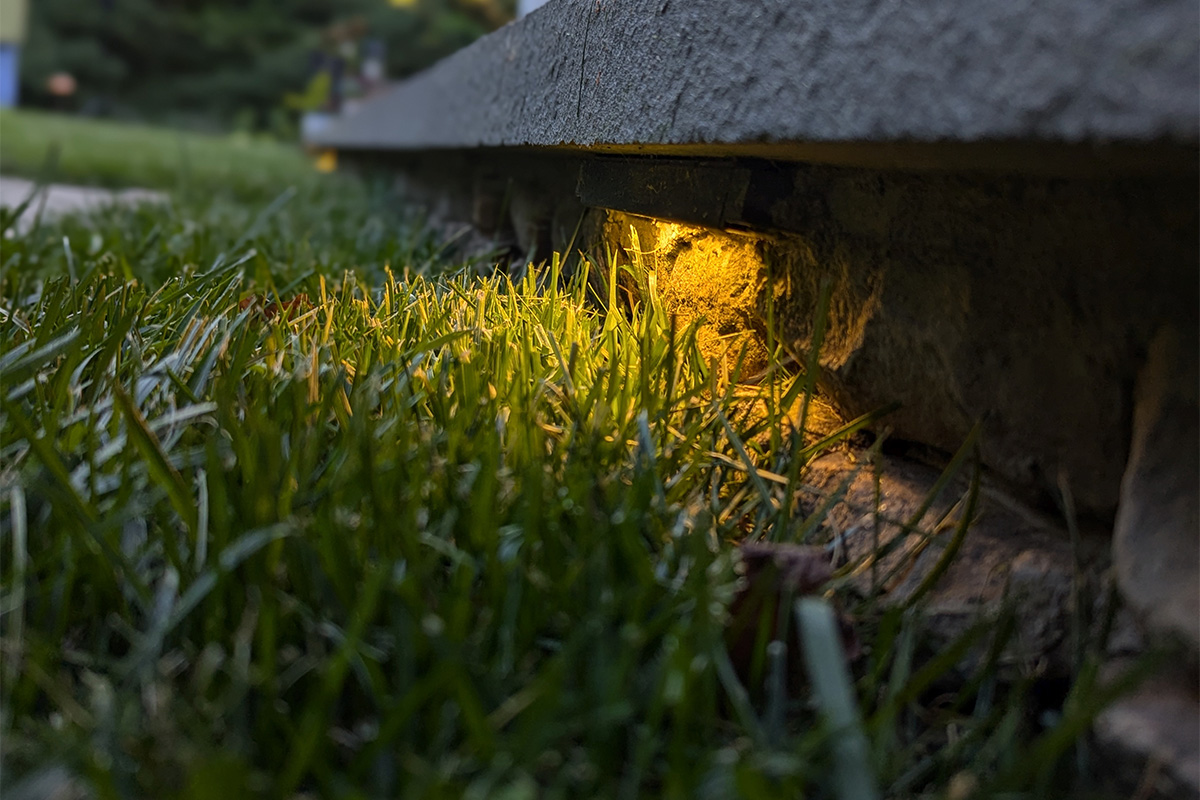 As the sun sets, the garden comes alive through a comprehensive low-voltage landscape lighting system. Up-lighting accentuates tree canopies and focal plantings, while path lights guide movement along the stone stairs and garden edges. Integrated wall lights and under-cap fixtures provide subtle, ambient illumination across gathering spaces, balancing safety with sophisticated visual impact.